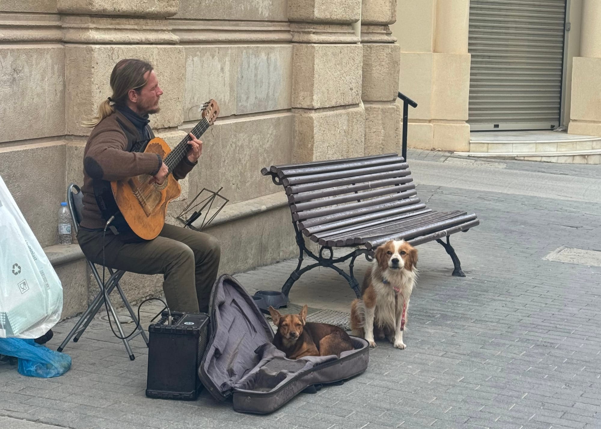 At one point, we saw a street musician playing music. He also had two very cute dogs with him, which immediately caught my attention. We stayed there for a moment, listened to the music, and just enjoyed the situation. It was a simple moment, but it made the day feel a bit more special.