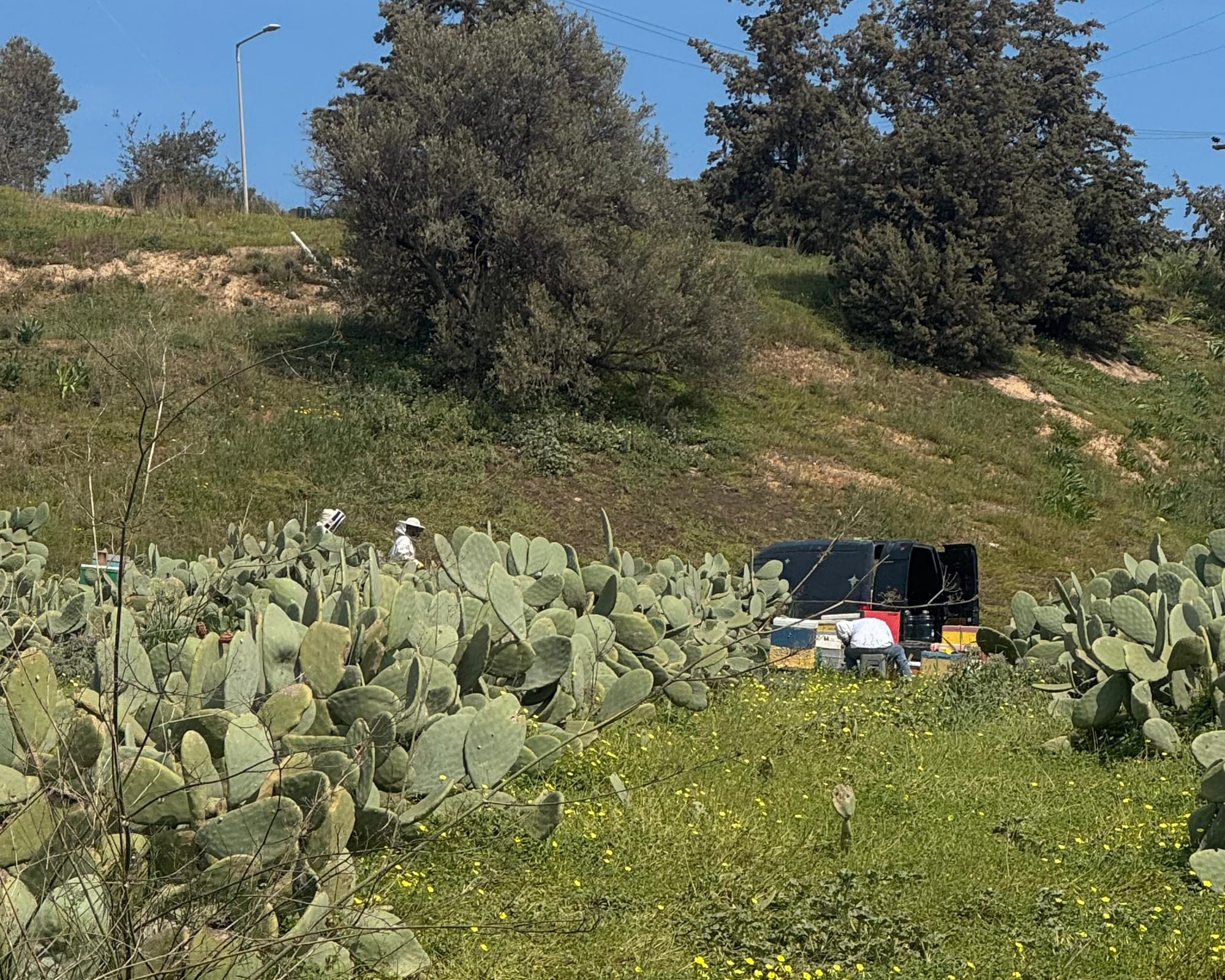 On Monday, I saw something interesting during my break at work. There were beekeepers working near a cactus field, which I had never seen before. It was something unusual and made my break more interesting.